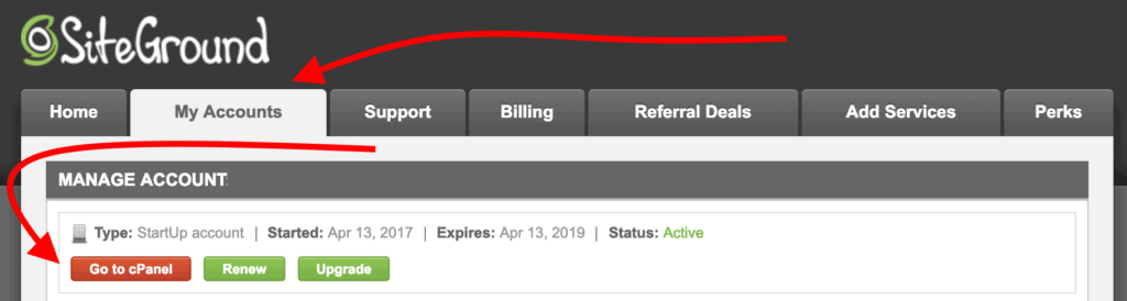 For example, if you're hosting your site with SiteGround, you can access cPanel from your user profile in the "My Accounts" tab: